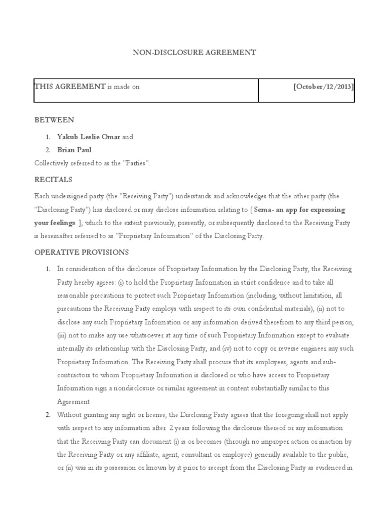 In a nutshell, if you are asked to sign an nda, you are. A non disclosure agreement is a legally binding document made between at least two parties that states that the information, knowledge, or anything else shared between them shall remain confidential. It sets out how you share information or ideas in confidence. This mutual nondisclosure agreement (the agreement) is entered into by and between. They allow the parties to share sensitive information without fear that it will end up in the hands of competitors.